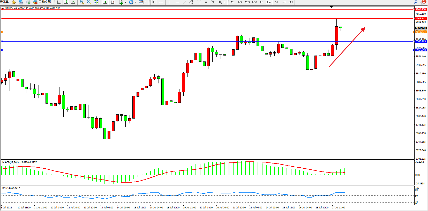 标普500指数7月27日(周三)收盘上涨99.40点,涨幅2.54%,报4020.45点;美联储将基准利率上调75个基点至2.25%-2.50%区间,为连续两次加息75个基点。美联储将贴现利率从1.75%上调至2.50%。重申持续加息可能是合适的。美联储准备酌情调整政策。