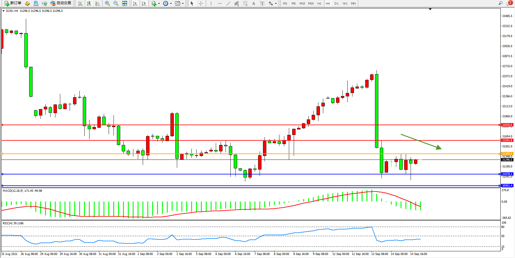 道琼斯指数9月14日(周三)收盘上涨30.12点,涨幅0.10%,报31135.09点;美国CPI数据强于预期,加剧了人们对美国通胀广度和速度的担忧。虽然本月汽油价格有所回落,但生产商在服务和部分商品方面仍然面临更高的成本。
