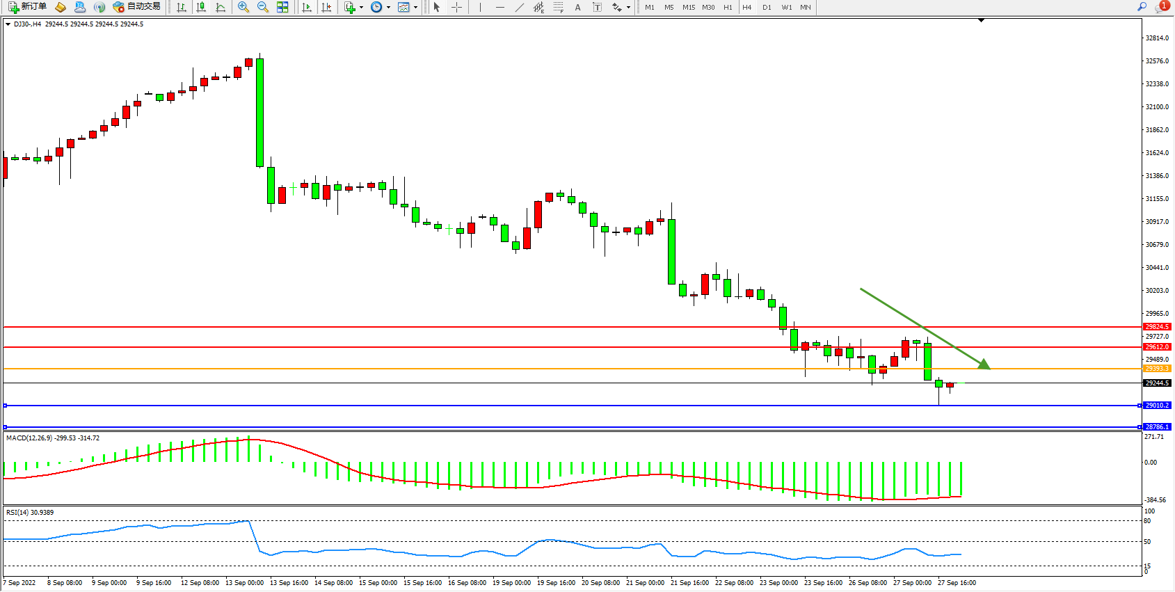 道琼斯指数9月27日(周二)收盘下跌123.91点,跌幅0.42%,报29136.90点;美股近期遭遇大力抛售,道琼斯指数跌创2020年11月以来新低。但只要物价和工资继续飙升,就业市场依然强劲,几乎不会促使美联储重新考虑政策计划,尽管美联储官员经常被指责操纵金融市场。