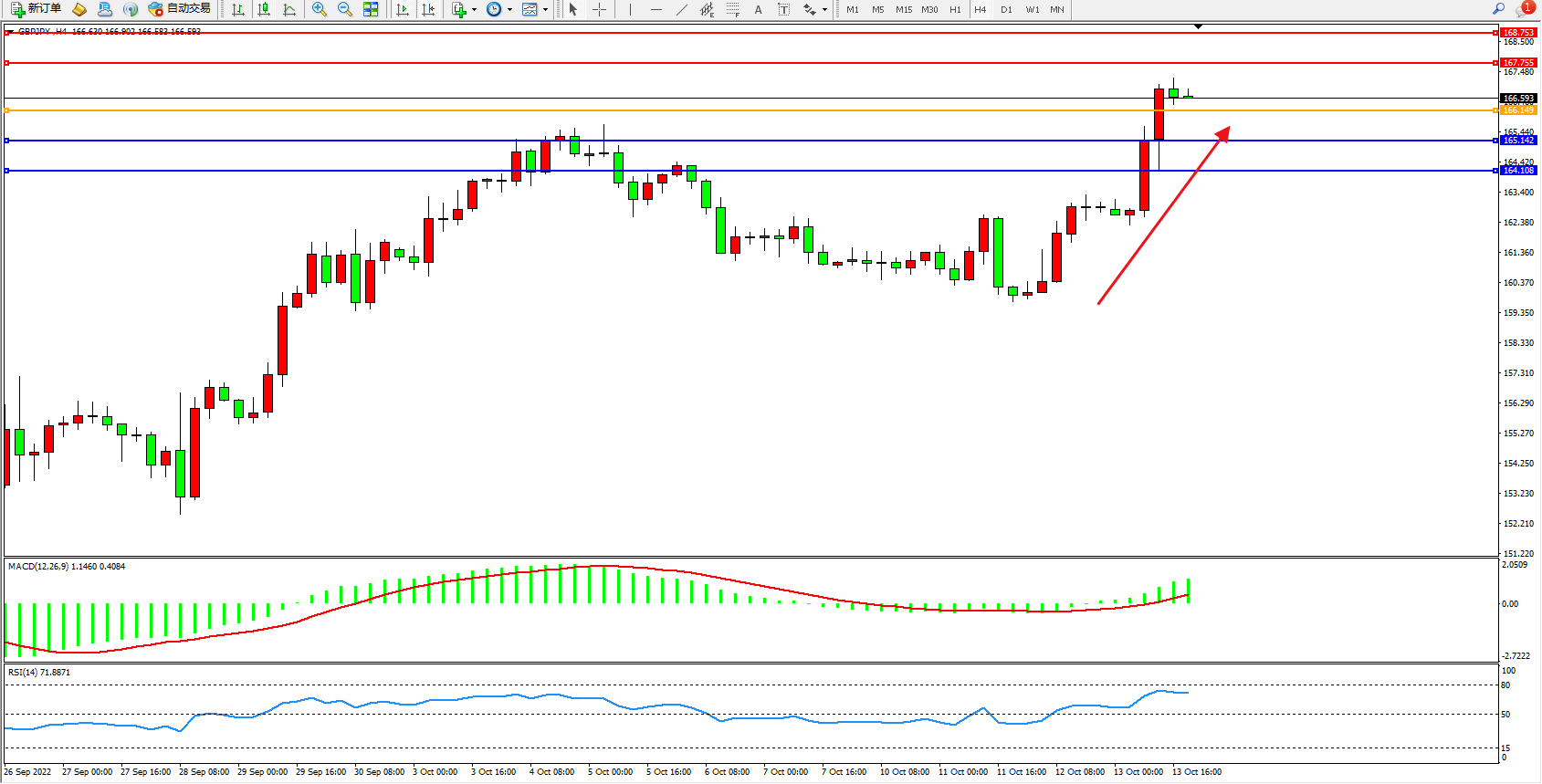 交易策略:166.149上方看涨,目标167.755、168.753