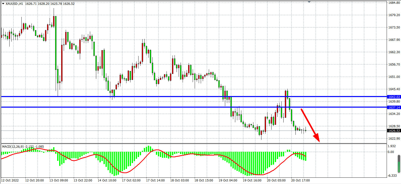 1小时图看,金价冲高回落,再度跌至前一个交易日的低点1625附近,MACD在零轴之下呈再度重新放量,显示行情有进一步扩大下跌的需求,目前阻力仍然维持在1637附近,在1637之下继续看跌,下方目标1615-1620。