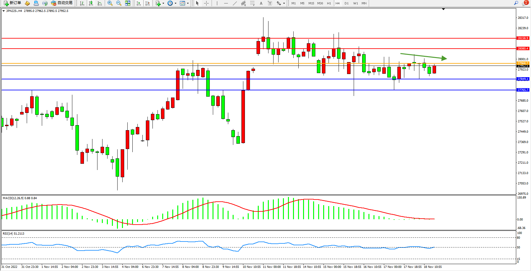 日经225指数11月18日(周五)收盘下跌31.57点,跌幅0.11%,报27899.00点。日本核心消费者通胀率10月达到3.6%的40年高点。黑田东彦表示,通胀率正在明显上升,但随着燃料和原材料成本飙升的影响消散,通胀率在下一财年可能会回到2%以下。