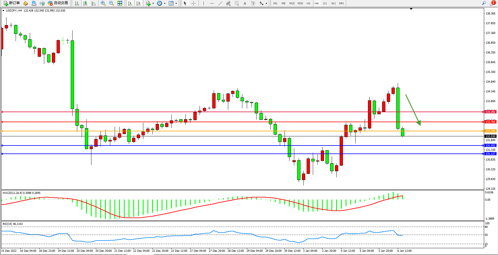 交易策略:132.295上方看涨,目标132.766、133.282