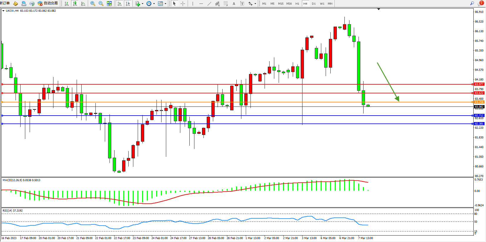 4小时图看:空头下移,市场空头情绪笼罩,短期跌势或将延续,市场整体处于下移趋势中,MACD指标处于多头区域持续下移,RSI指标处于50均衡线下侧弱势徘徊;