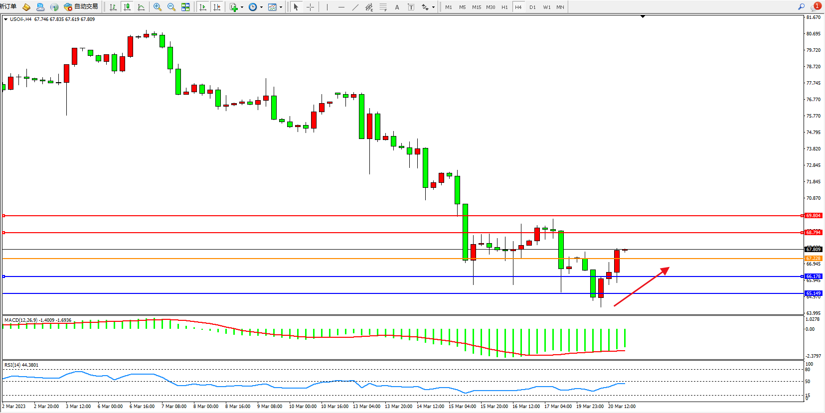 交易策略:67.228上方看涨,目标68.794  69.804