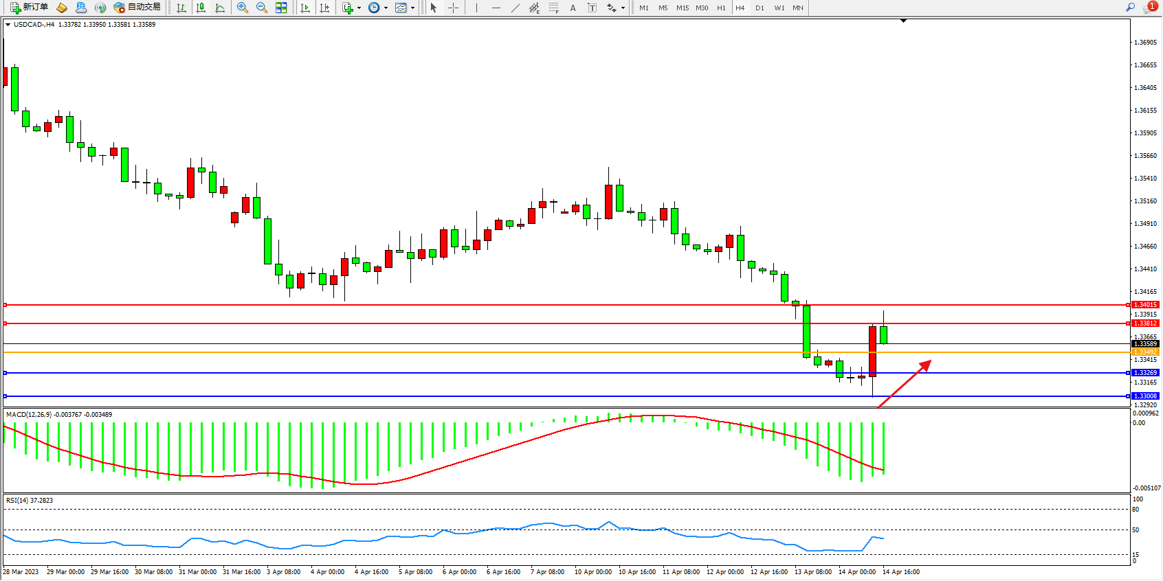 4小时图看:低位多头动力强势拉升,短期多头动力伺机入场上扬,市场看涨情绪开始涌现,MACD指标处于空头区域低位上移,RSI处于空头区域低位上行;