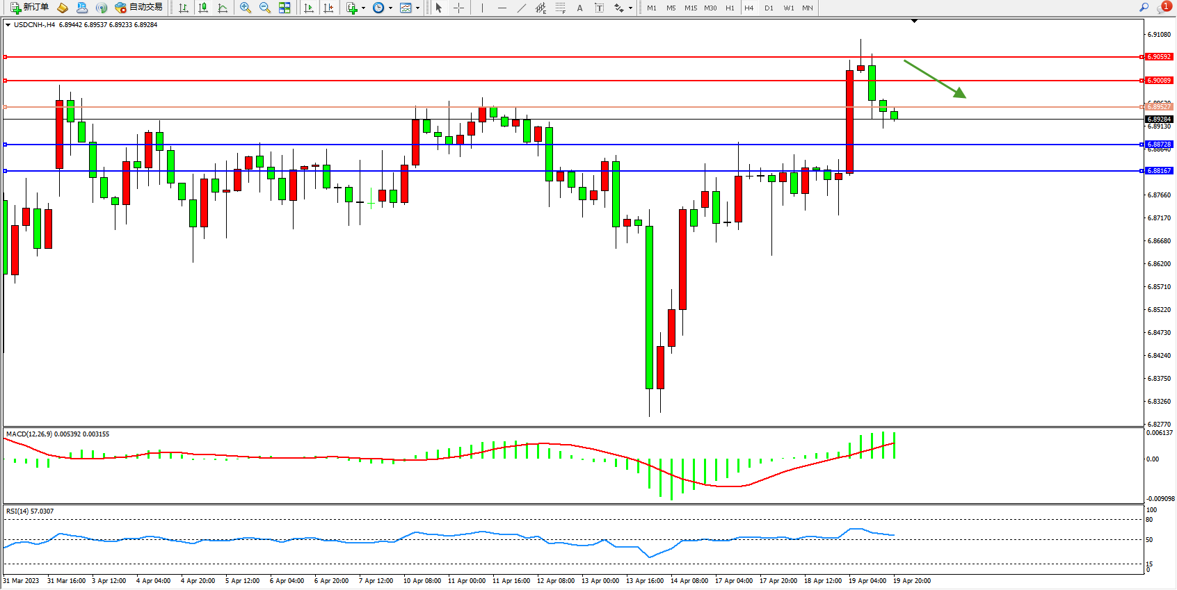 美元人民币USDCNH——4小时K线图显示: