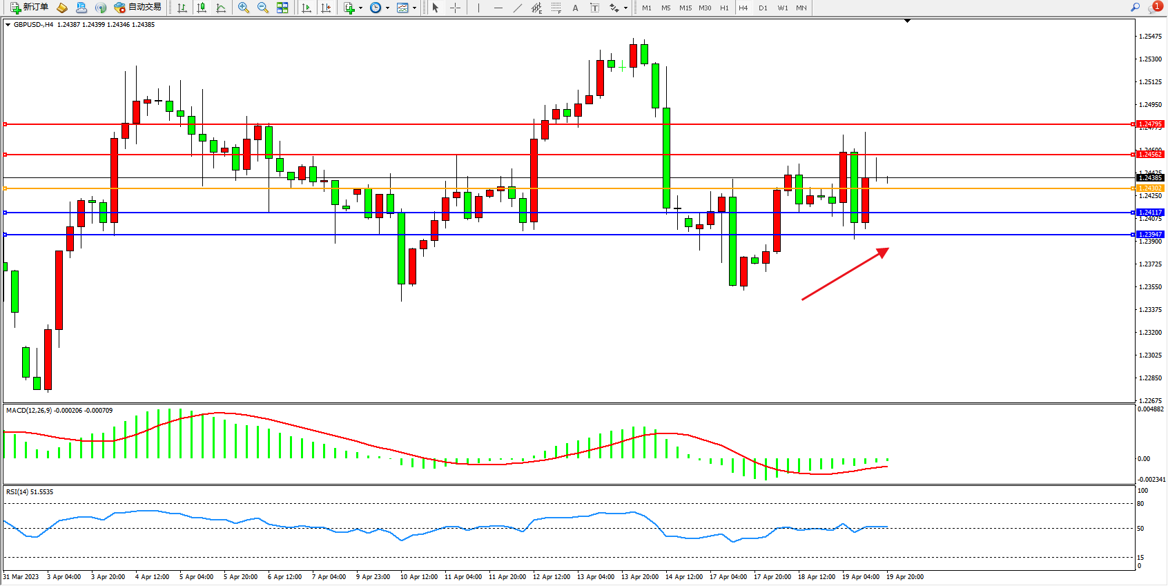4小时图看:市场看涨情绪依旧,多头多动力维持宽幅震荡向上移动,短期多头区域持续上行,MACD指标维持弱势整理上移至0轴线附近徘徊,RSI指标处于50均衡线附近弱势整理;