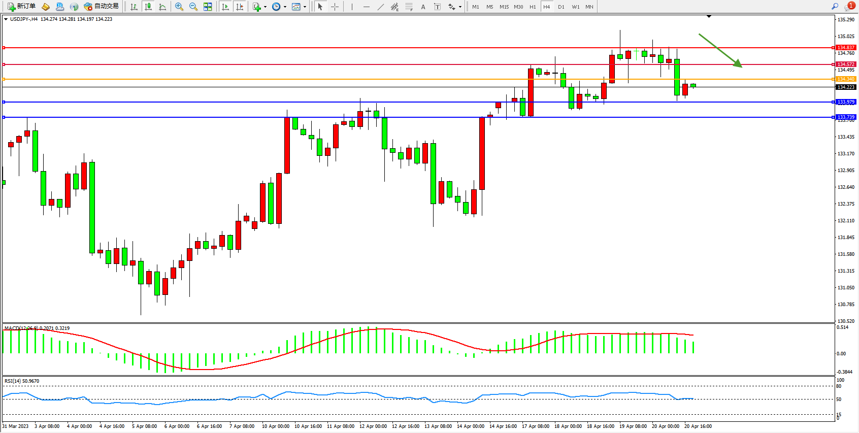 美元兑日圆维持134.223附近震荡,由于燃料价格回落和进口成本下降,日本3月的贸易逆差连续第二个月缩小。日本贸易逆差从2月份修正后的8981亿日圆缩减至7545亿日圆。进口同比增长7.3%,为两年来的最小增幅,因日圆走强和石油等大宗商品价格下跌压低了进口成本。