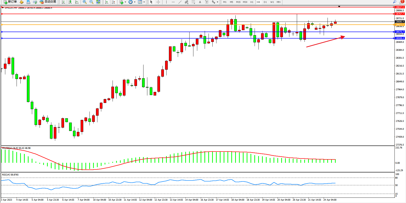 4小时图看:多头动力高位窄幅整理后缓慢上行,市场看涨情绪依旧,但依旧维持窄幅震荡走势中,MACD指标处于0轴线上側整理,RSI指标处于50均衡线上側弱势徘徊;