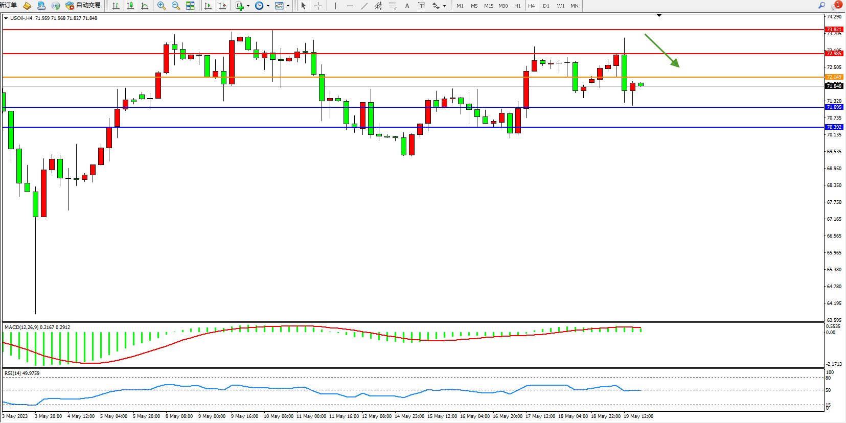原油维持71.848附近震荡,油价周五由升转跌,美国众议院共和党人和总统拜登的政府暂停了有关提高举债上限的谈判,令可能削减能源需求的违约风险增加。