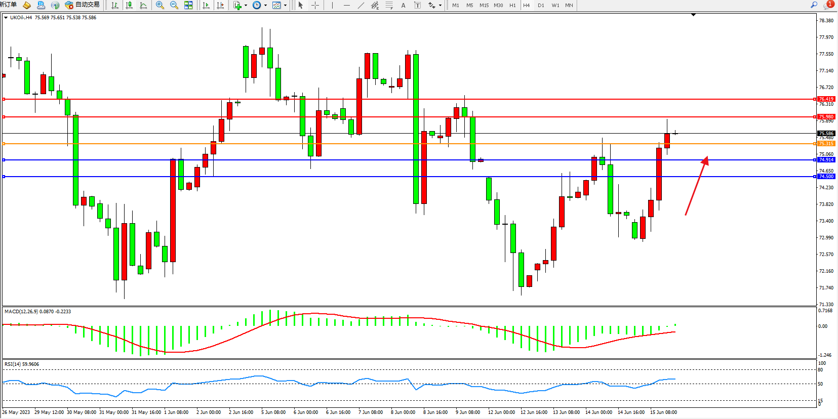 交易策略:75.315上方看涨,目标75.860  76.419