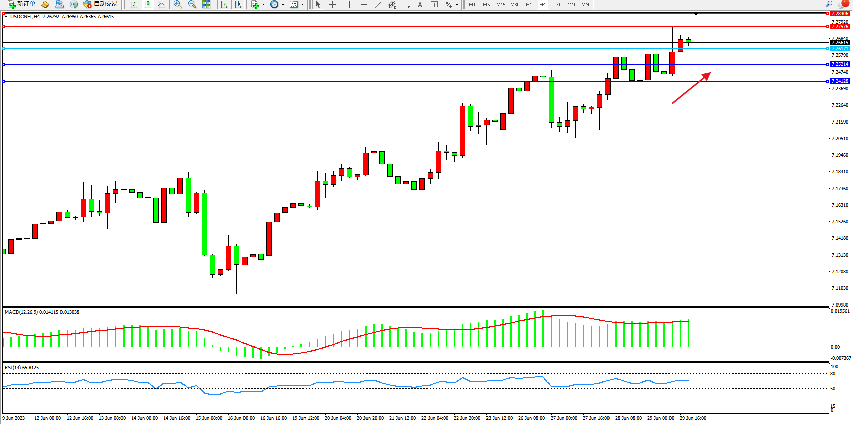 交易策略:7.26171上方看涨,目标7.27576  7.28406