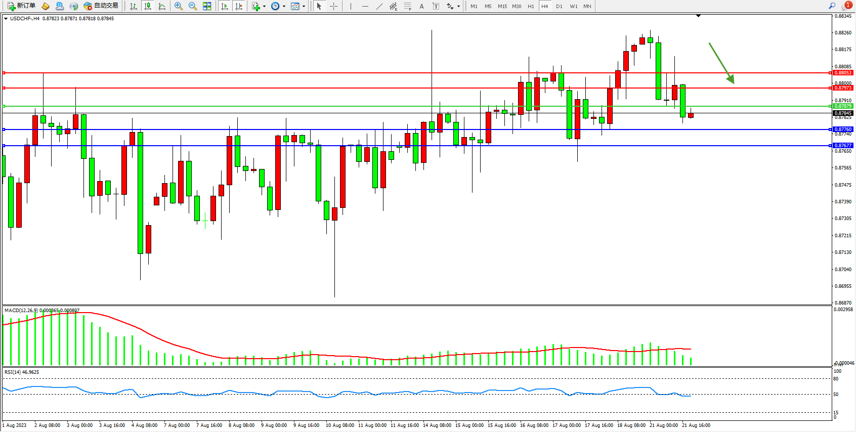 美元兑瑞郎维持0.87845附近震荡,瑞银经济学家上调了对全球股市的评级,因近期的经济和通胀数据超出预期,而且美国经济增长强于预期,经济衰退的可能性下降。