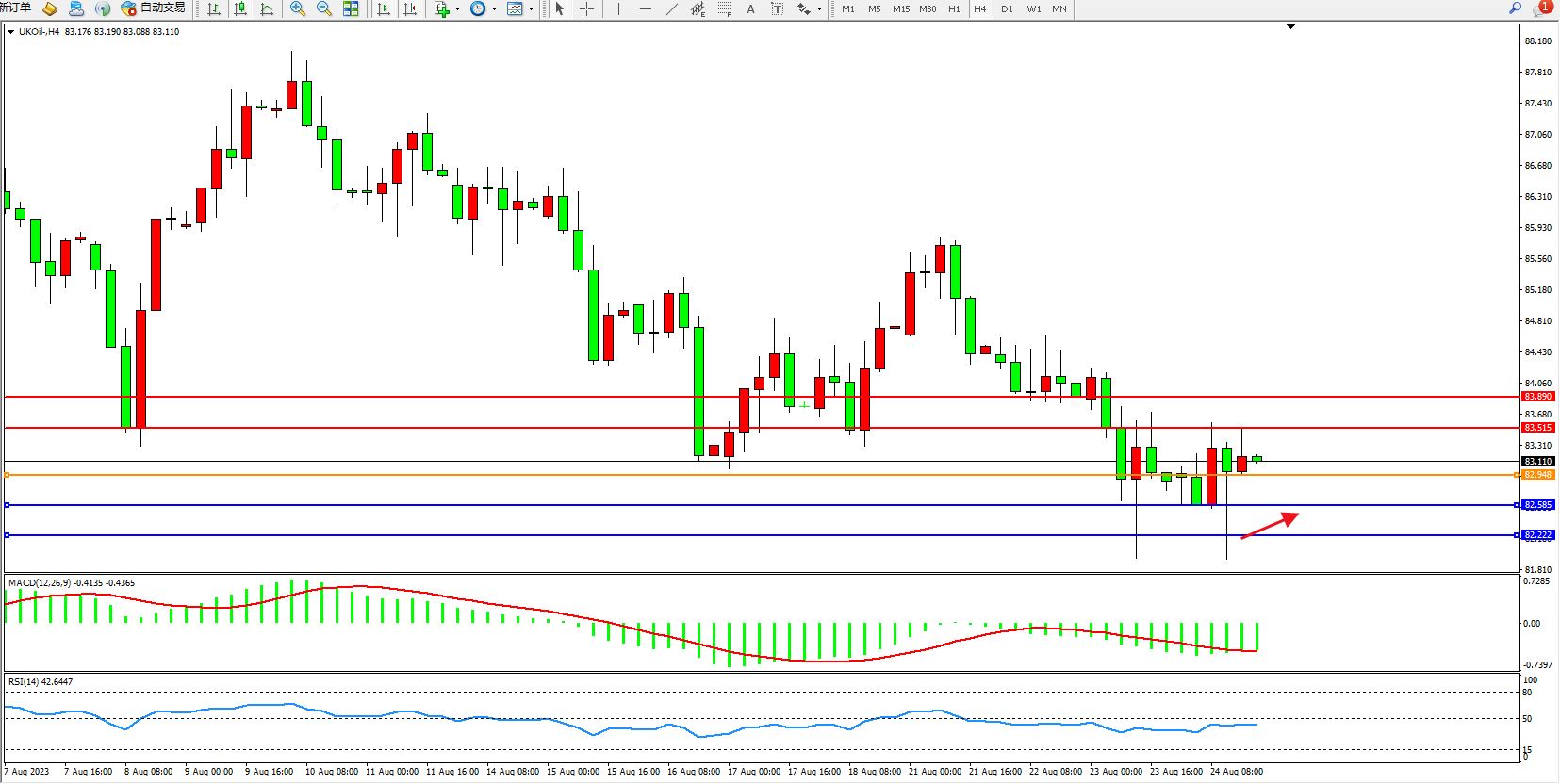 4小时图看:空头动力跌势减弱,多头情绪逐渐涌现,短期开始低位震荡后有反转上移迹象,MACD指标处于空头区域维持整理,RSI指标处于50均衡线下侧弱势徘徊;