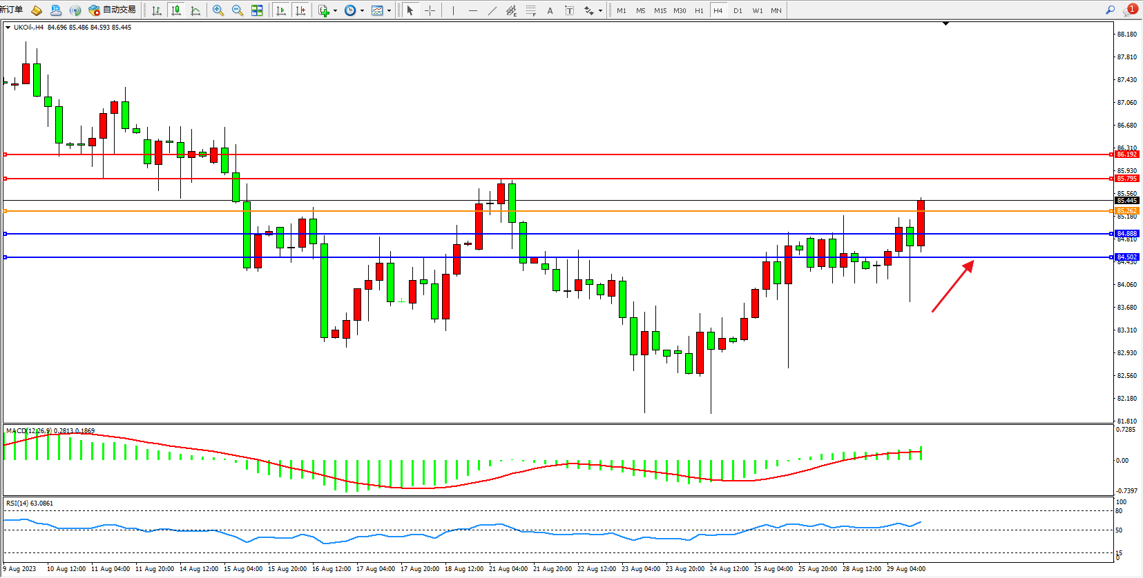 4小时图看:多头动力震荡上行,短期维持整理后有继续向上移动态势,MACD指标处于多头区域维持整理,RSI指标处于50均衡线上側弱势徘徊;