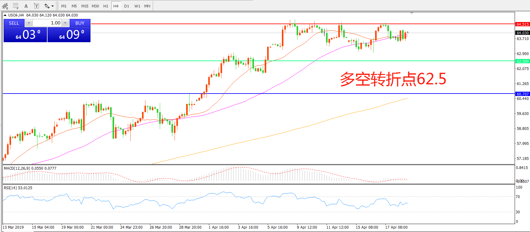 由于4月19日为欧美耶稣受难日假期,全天休市。多数市场参与者已经开始长周末假期。美国石油活跃钻井数下降为油价提供一定支撑,但减产行动的不确定性以及美国对伊朗制裁的执行程度均令油价涨势遭受抑制。美国原油周四(4月18日)小幅收涨,报64.03美元/桶。