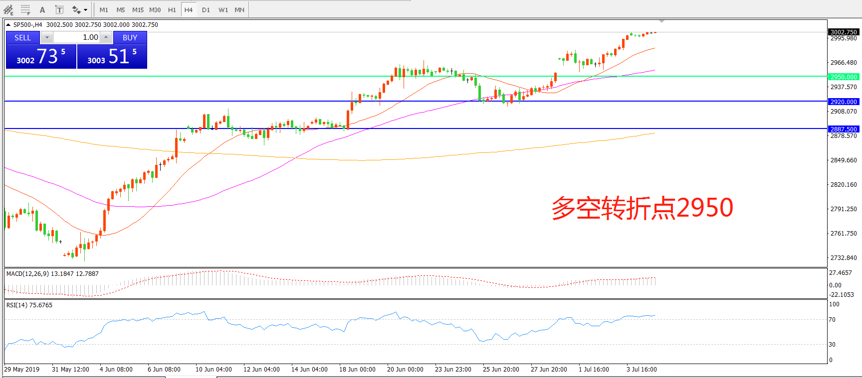4小时图看,标普站稳2950后震荡上行,反弹动能较强,均线系统粘合成为下方支撑,MACD红柱增加,RSI指标拐头向上,日内延续上行概率较大。