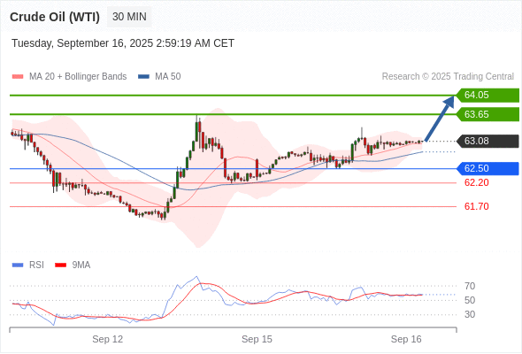 在 62.50 之上,看涨,目标价位为 63.65 ,然后为 64.05 。