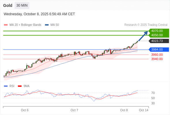 在 3984.00 之上,看涨,目标价位为 4050.00 ,然后为 4070.00 。