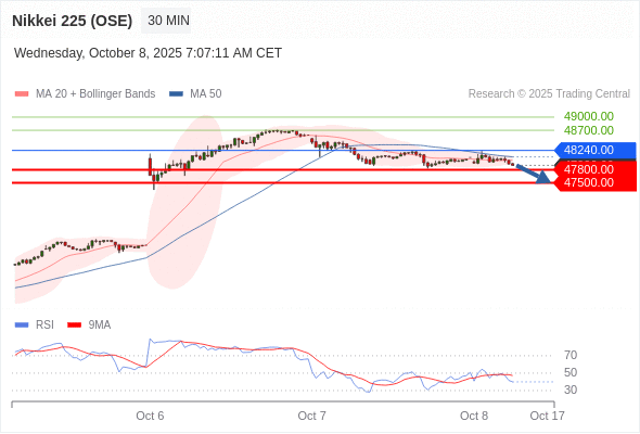 在 48240.00 之下,看跌,目标价位为 47800.00 ,然后为 47500.00 。