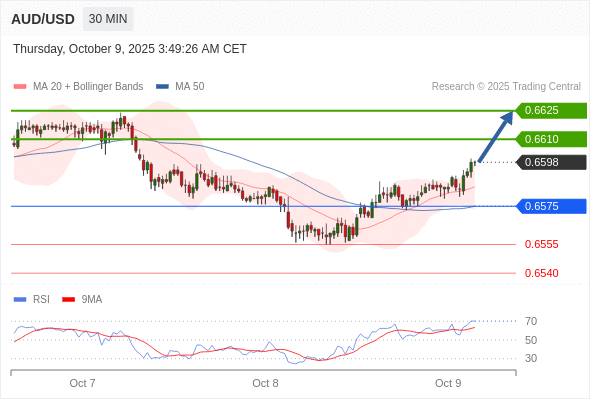 在 0.6575 之上,看涨,目标价位为 0.6610 ,然后为 0.6625 。