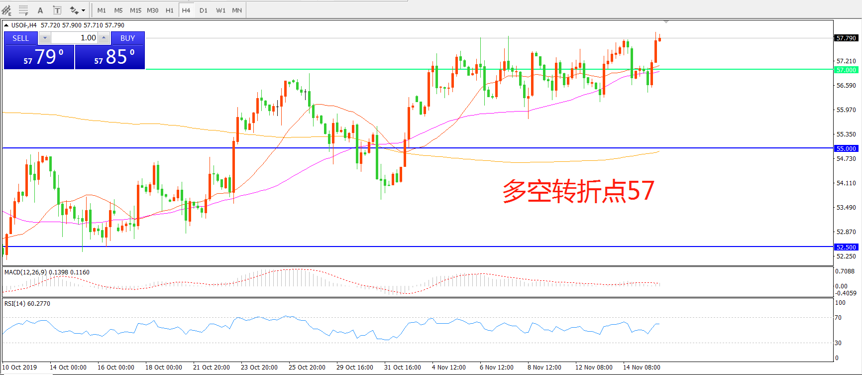 4小时图看,油价整体呈现震荡上行,振幅逐渐收窄,57美金成为多头支撑,均线系统走平,MACD红柱增加,RSI指标走平,日内延续上行概率较大。
