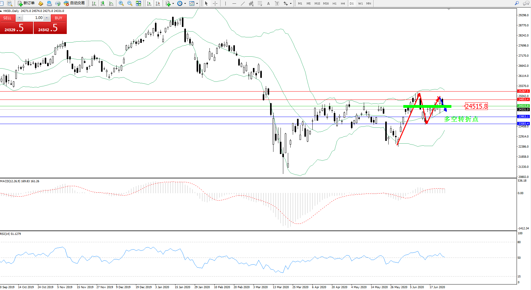 香港恒生指数6月26日(周五)收盘下跌231.59点,跌幅0.93%,报24549.99点;港股三大指数全日走弱,国指跌0.84%报9853点。大市交易较为清淡,成交额不足千亿港元。因端午节假期,港股本周仅4个交易日。恒指本周累计跌幅达0.38%,最高点为25071.32点,最低点为24184.88点。半导体逆势领涨,华虹半导体大涨近6%,中芯国际升超4%再创新高;手机概念股、生物医药股普涨,舜宇大涨超5%领涨蓝筹;盘中再次破顶;腾讯跌超1%,拖累恒指下跌35点;国美系分化严重,拉近网娱大幅收涨超52%,国美零售大跌8.64%。港股延续近期强势,并沿上升通道挺进,但上方压力开始浮现,由于累积较大获利需求,短线大盘或需进行休整,但预计行情整固过后,港股仍将延续上行趋势,投资者可根据自身仓位适度调整持仓水平。