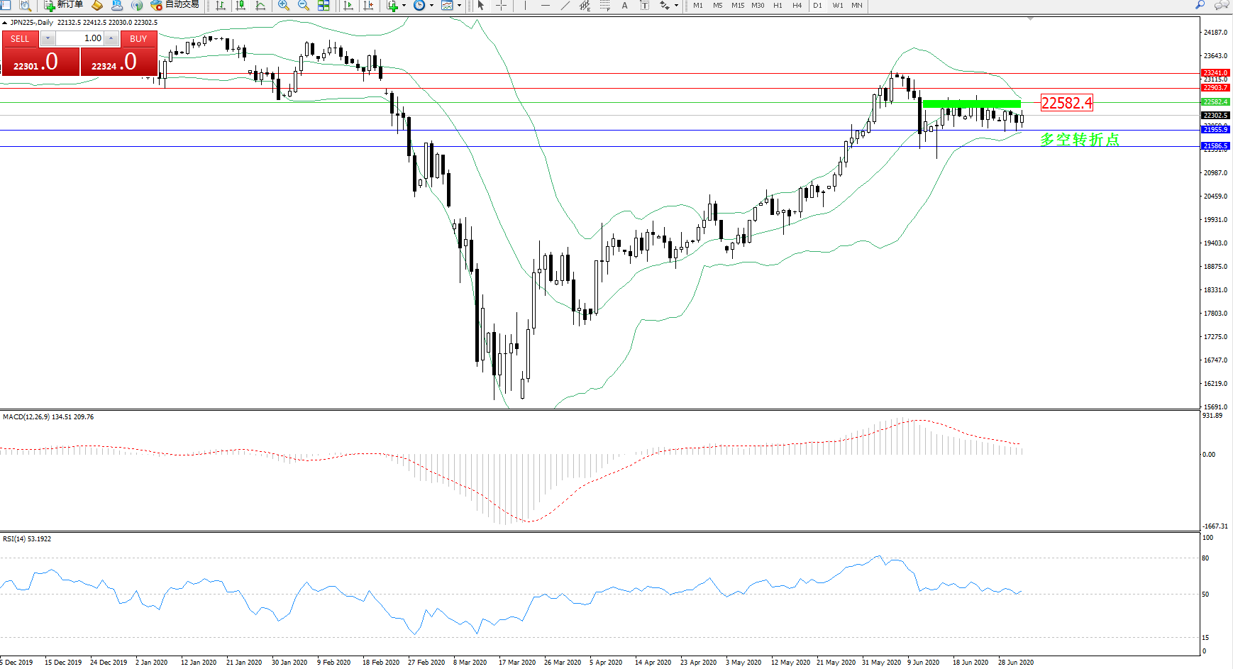 日经225指数7月2日(周四)收盘上涨6.27点,涨幅0.03%,报22128.00点。日本首相安倍晋三:密切关注东京疫情局势,就疫情问题与东京政府密切合作,亚洲股市追随欧美股市上涨,风险偏好得到支撑。离岸资金流入区域股市指数。美联储在6月初的货币政策会议上没有表现出实施收益率曲线控制措施的意愿,但确实表示渴望在未来几个月内就利率路径和资产购买前景提供更多指引。美国6月新增480万个岗位,创历史新高。失业率降至11.1%,但病毒大流行使就业人数进一步增长的前景黯淡。美国非农就业数据公布后美股三大股指期货迅速上扬。