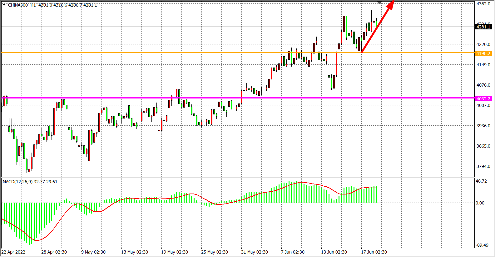 1小时图看,沪深300指数上破4190后,阻力已转化为支撑,当前再度回踩4190企稳延续涨势,MACD在零轴之上开始重新放量,日内在4190之上继续看涨,目标4320-4450