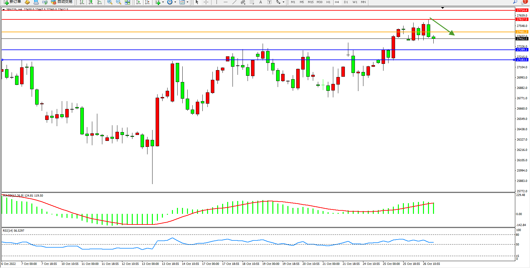 4小时图看:高位短期维持窄幅整理,市场空头动力有伺机入场迹象,短期开始缓慢向下移动,MACD指标处于多头区域高位整理,RSI指标处于50均衡线上側徘徊;