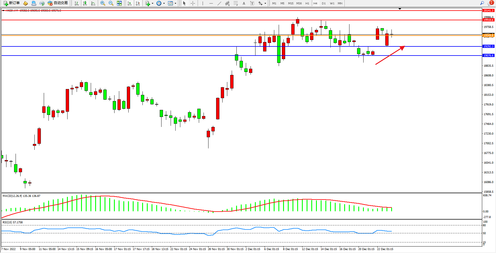 4小时图看:短期纠结高位维持窄幅震荡,市场多头出现减弱迹象,MACD指标处于0轴线上側弱势徘徊,RSI指标处于50均衡线上側弱势整理;