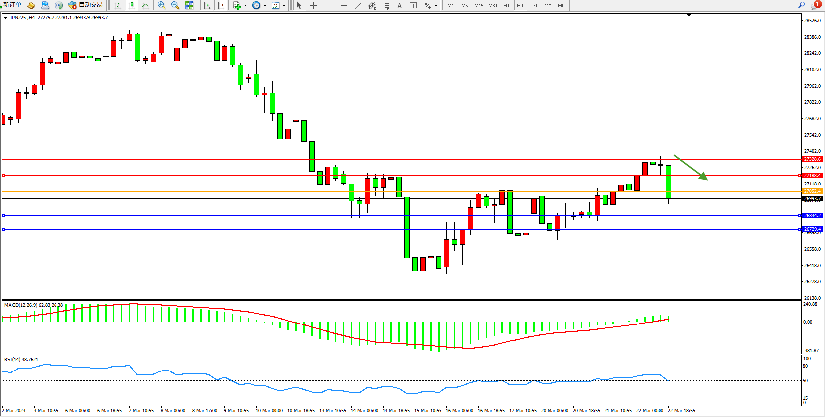 日经225指数3月22日(周三)收盘上涨521.83点,涨幅1.94%,报27467.50点。对日本央行的具体政策手段不予置评,但预计日本央行将与政府密切合作,并在新任行长的领导下指导适当的政策措施。