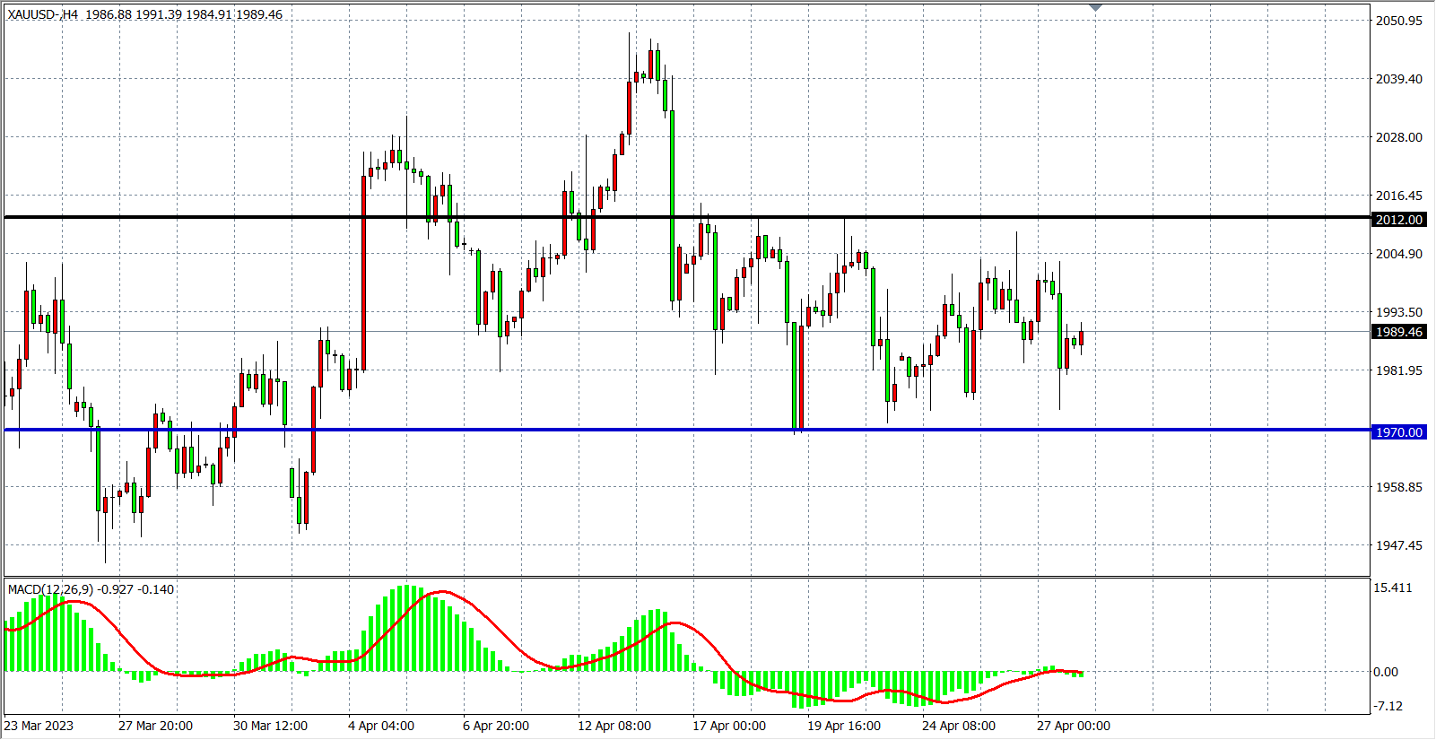 4小时图看,黄金继续维持1970-2012的宽幅整理格局,MACD量能在零轴附近缩量,行情有待方向选择,上方阻力关注2012,破位看涨2030-2045;下方支撑关注1970,跌破看1950-1920,在区间内高抛低吸为主。