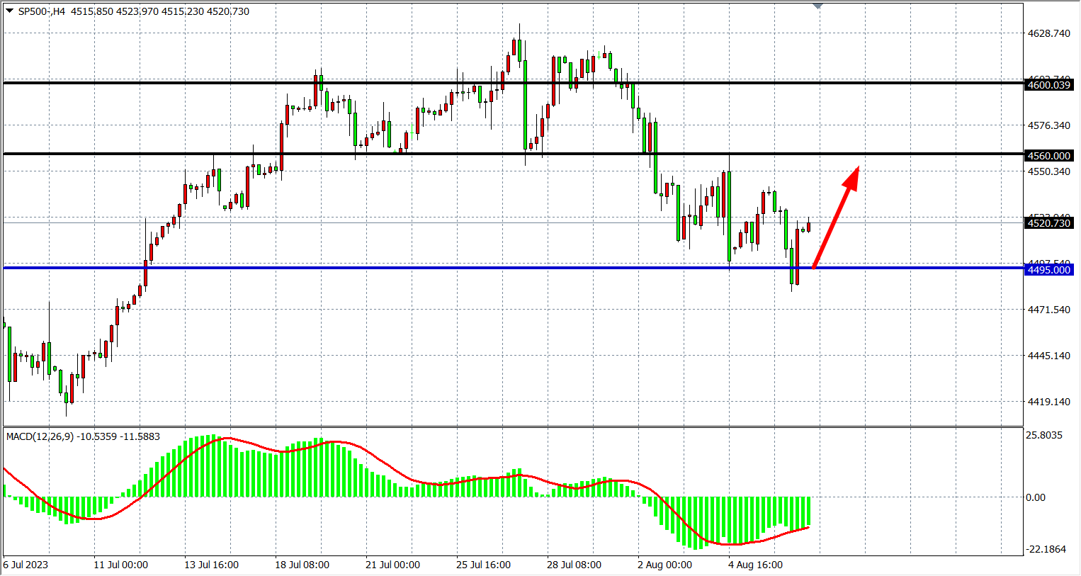 4小时图看,标普触及4495支撑后再度反弹,MACD量能在零轴下缩量,行情走势仍较疲弱,支撑关注4495附近,阻力关注4560附近。