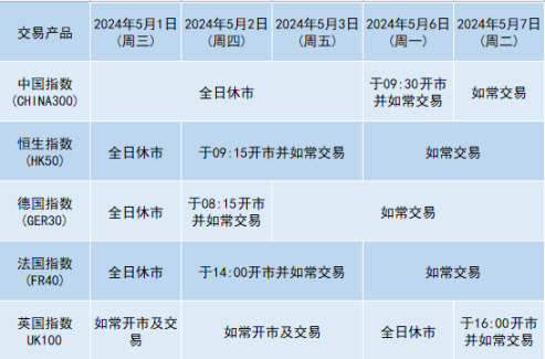 因应2024年5月1日(周三)及2024年5月6日(周一) 为劳动节及英国银行假期关系,本公司以下产品的交易时间将于假期期间作以下安排,敬请留意。